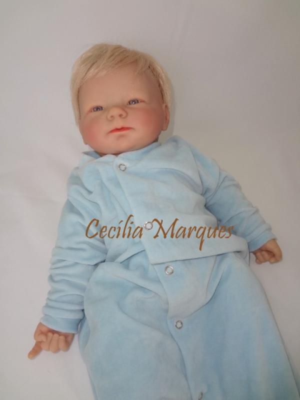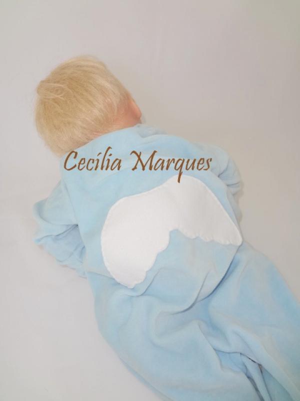 Macacão (vira pé) confeccionado em plush com aplicação em tecido de tricoline (100% algodão) ou cetim, pespontado.