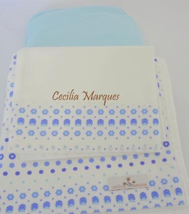 Lençol confeccionado em suedine (lençol com elástico) e em percal 200 fios (virol e fronha), os detalhes são em tricoline.